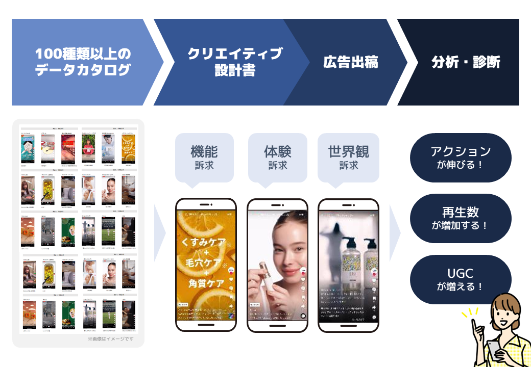 TikTok・Instagramの業界・業種に特化した100種類以上のデータカタログから、最適なクリエイティブの訴求軸や見せ方を設計・診断し、今後のアカウント成果に貢献します。