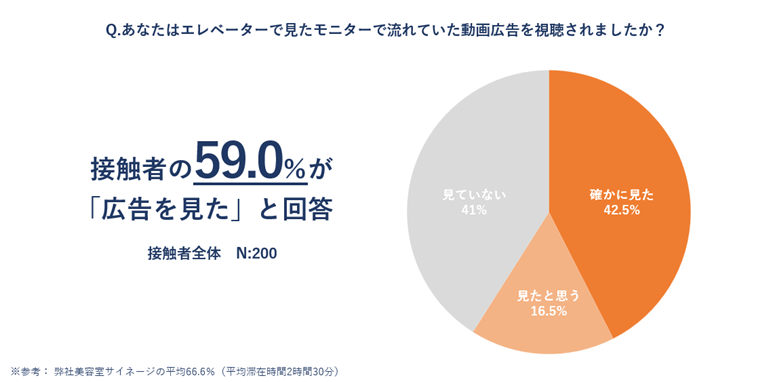 エレベーターという滞在時間が短い(平均15~20秒)環境にも関わらず接触者(該当期間にELEVATOR TVのモニターを見た方)の約60%が該当のCMを見たと回答しました。CMerTVが展開している美容室サイネージ「BEAUTINISTA TV」(平均滞在時間150分で視認率平均が66.6%)と比較しても遜色ない結果が得られました。