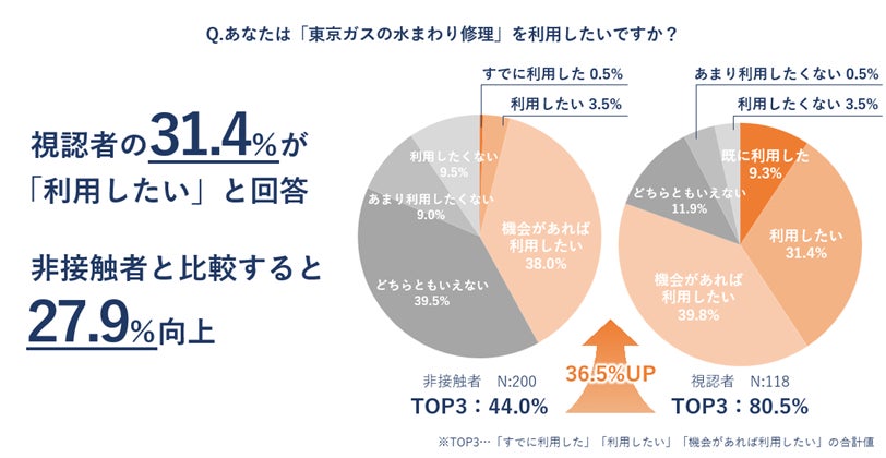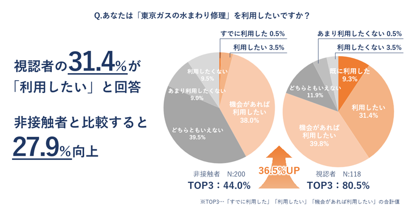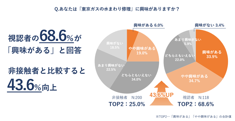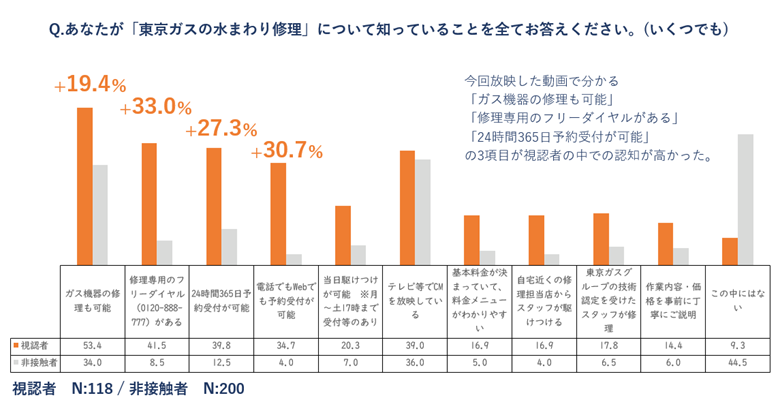 また、CV(サービスの利用)に繋がるような「修理専用のフリーダイヤルがある」「24時間365日予約受付が可能」「電話でもWebでも予約受付が可能」といった項目が大きくリフトしており、ターゲットとなりうる生活者にリーチしていたことが推測されます。実際に本施策の実施中に放映先のマンションでの契約もされています。