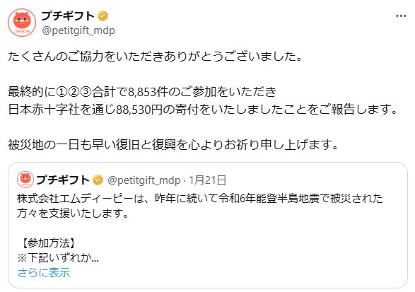 デジタルクーポン配信システム「プチギフト(R)」を提供する、株式会社エムディーピー (以下「MDP」、東京都港区、代表取締役:星田 洋伸)は、能登半島地震により被災された方々を支援するため、88,530円の寄付を実施いたしました。