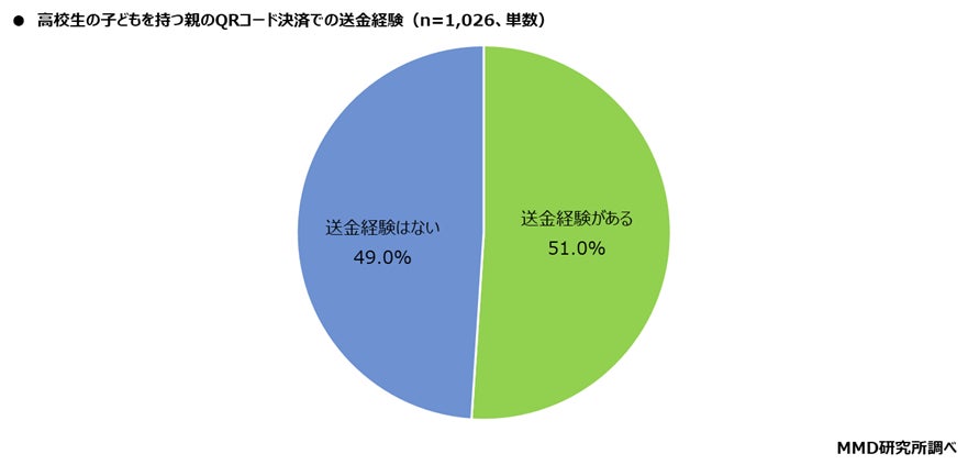 高校生の子どもを持つ親でQRコード決済を利用している1,026人を対象に、直近半年の送金機能の利用経験を聞いたところ、51.0%が「送金経験がある」と回答した。