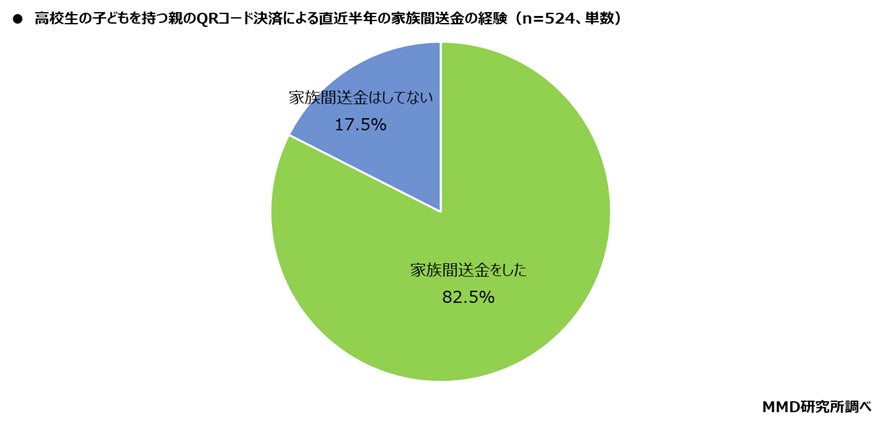 次に、直近半年で送金経験があると回答した524人を対象に、直近半年の家族間送金利用経験を聞いたところ、82.5%が「家族間送金をした」と回答した。