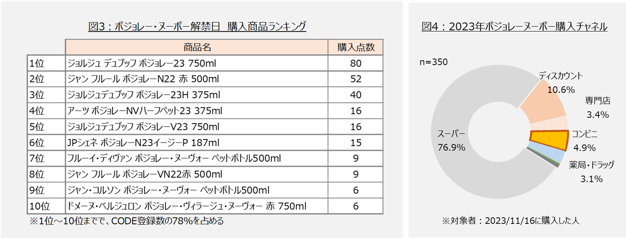 購入本数ランキング1位は、『ジョルジュ デュブッフ』で全登録数の25%を占める(図3)。尚、10位まででCODE登録数の78%を占める。