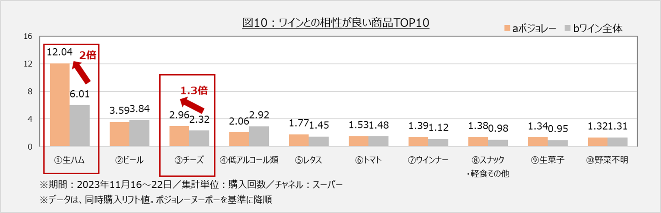 ランキング上位は、「生ハム」、「ビール」、「チーズ」等。特筆すべきは「生ハム」と「チーズ」で、ボジョレー・ヌーボーとの相性が非常に良く、さらにワイン全体と比べても「生ハム」は2倍、「チーズ」は1.3倍買われることが分かった(当社サービス「買いログView」生鮮・総菜版より)。