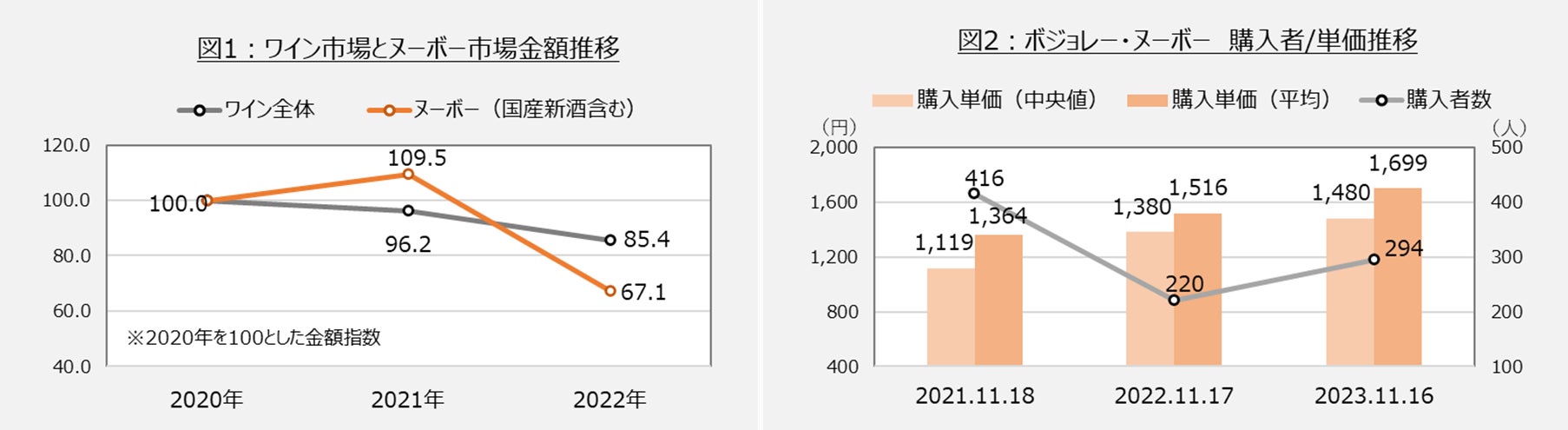 ワインとヌーボー(国産新酒含む)の金額を2020年=100とした指数でみると(図1)、2021年は家ナカの楽しみとしての需要が後押ししヌーボーは好調であったが、2022年はワイン全体が不調な中で、ヌーボーは値上げも影響しそれ以上に不調であった。