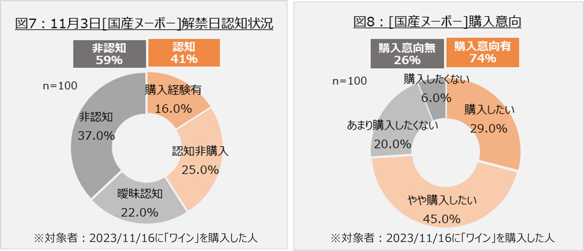 2023年のボジョレー・ヌーボー解禁日に「ワイン」カテゴリを購入した人を対象に、国産ヌーボーの認知状況をCODEアプリで聴取した(図7)。国産ワインが伸長するなか国産ヌーボー購入経験者は16%に留まり、認知非購入を合わせた認知率は41%と半数を下回った。普段ワインを購入している層においてもまだまだ認知度は低いといえる。