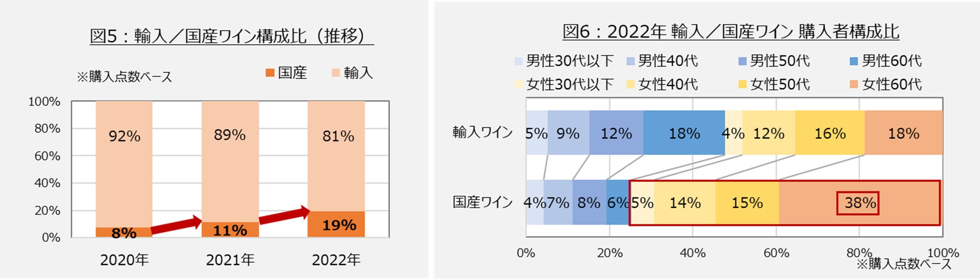 2020年から2022年における輸入ワインと国産ワインの構成比を見ると(図5)、2022年には国産ワインが約2割を占めるまでに成長。背景には輸入ワインの価格高騰のなか、国産のヌーボーで盛り上げようとメーカーや小売が注力し売り場を拡大したり、G7広島サミット(23年5月21日閉幕)で山梨産ワインが提供されたりと、国産ワインへの関心が高まっていることもひとつ。では、輸入ワインと国産ワインの飲用層に違いはあるのか?(図6)