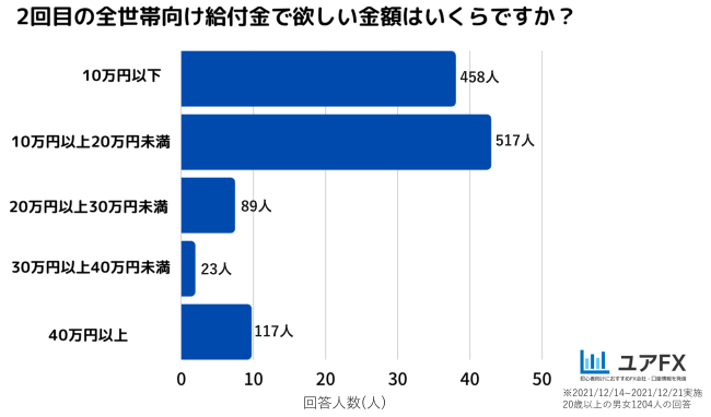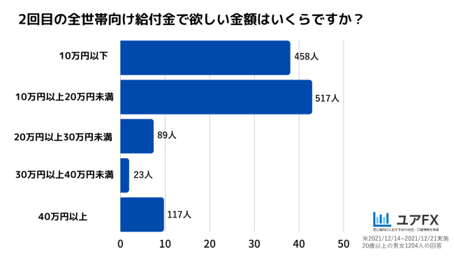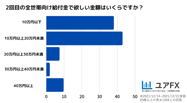 2回目の全世帯向け給付金で欲しい金額は「10万円以上20万円未満」が約43%と最多