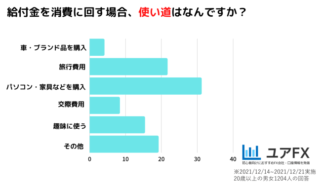 また、検討している給付金の貯蓄以外の使い道はパソコンや家具などの生活用品・雑貨の購入に充てると回答した方が全体の31.2%でトップという結果となりました。