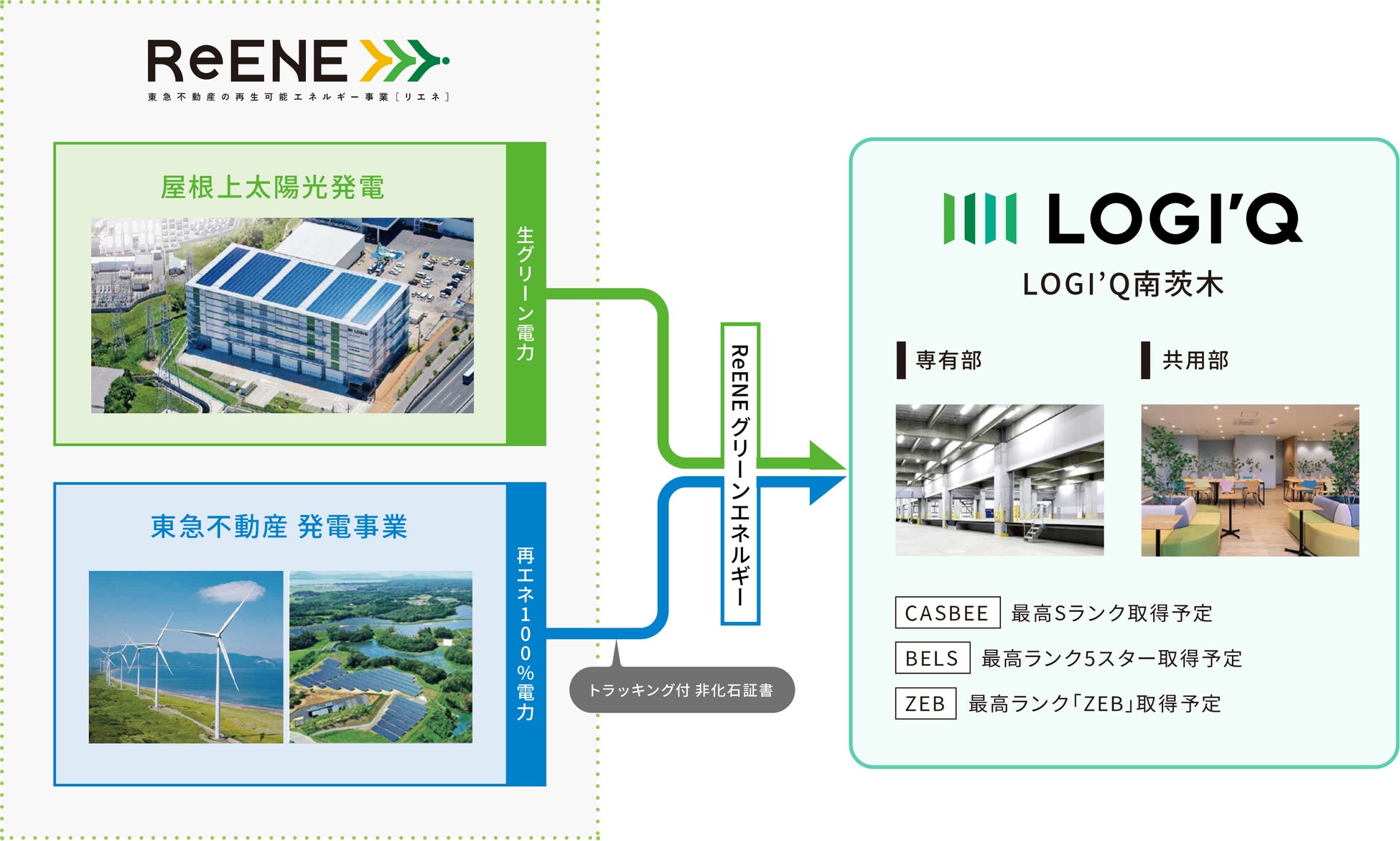 あわせて、環境負荷軽減サービスとしてテナント様向けに当社再エネ発電所由来の電力「ReENEグリーンエネルギー」を提供することで、テナント企業様自身や荷主企業様の脱炭素への取り組みを後押しするとともに、屋根上太陽光発電による生グリーン電力の施設内利用を実現することで、電気使用料の安定にも寄与いたします。