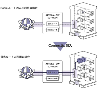 「エヌアセット光」導入物件の入居者は、つなぐネットのオプションサービス「Connectix(コネクティクス)」を利用できます。本オプションは、ソフトウェア(SD-WAN※3)技術を活用して、仮想ネットワーク上でマンション内の住戸毎に通信品質をコントロールする、アルテリアグループが開発した通信サービスです。他の利用者のトラフィックによる影響が少なくなり、常に快適な通信環境でのインターネット利用が可能となります。オンラインからの申し込みで工事不要、即日利用できます。[月額2,200円(税込)]