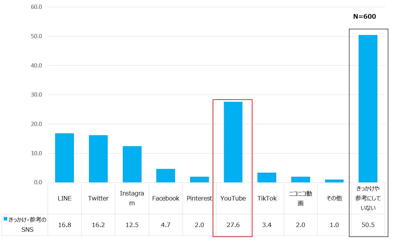 SNSの内訳としては、YouTube(27.6%)、LINE(16.8%)、Twitter(16.2%)がトップ3ボックスとなっています。