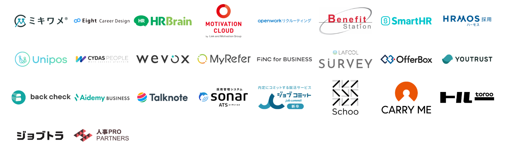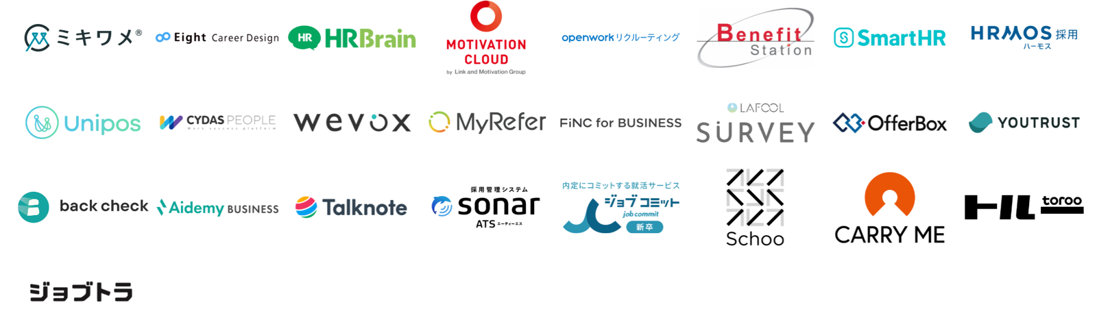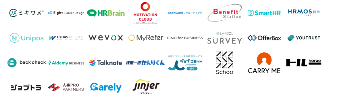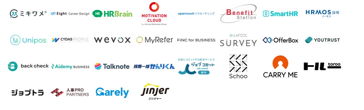 アイデミー、アトラエ、オープンワーク、サイダス、ダトラ、ビズリーチ、ベネフィット・ワン、ラフール、リアステージ、リアライブ、リーディングマーク、リンクアンドモチベーション、FiNC Technologies、Hajimari、HRBrain、HRクラウド、iCARE、i-plug、jinjer、MyRefer、Piece to Peace、ROXX、Sansan、Schoo、SmartHR、Talknote、Unipos、YOUTRUST