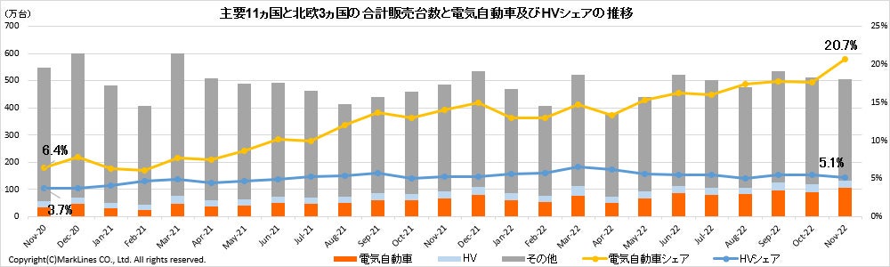 主要11カ国とノルウェー、スウェーデン、フィンランドの北欧3カ国(計14カ国)の11月における電気自動車販売台数は、104.5万台と初の100万台超となった。前年同月比は53.8%増、前月比も15.6%増という結果になった。