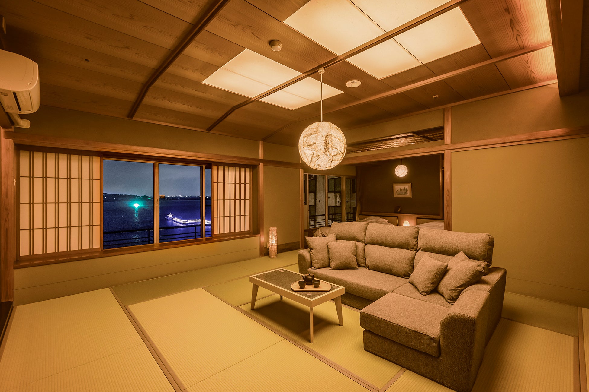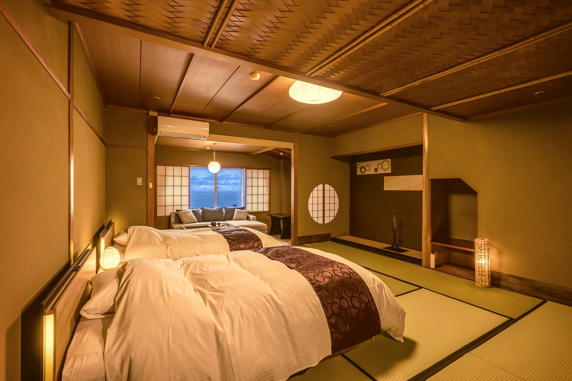 NEW MARUYAホテルは、新たに露天風呂*付き客室を増設しました。オープンエアを感じながらも、プライバシーに配慮した造りで、気兼ねないご入浴をお楽しみいただけます。お部屋は、和室にベッドを設置した和モダンスタイルとなります。