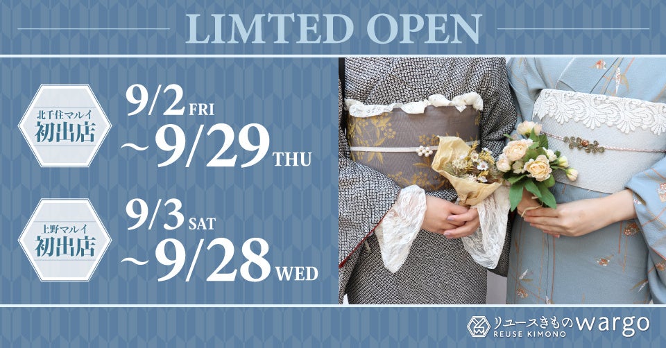 株式会社和心(本社:東京都渋谷区/代表取締役 森 智宏 証券コード:9271 以下、「当社」)が運営する「リユースきものwargo」は、北千住マルイ3階に2022年9月2日(金)〜2022年9月29日(木)、上野マルイ2階に2022年9月3日(土)〜2022年9月28日(水)期間限定オープンします。