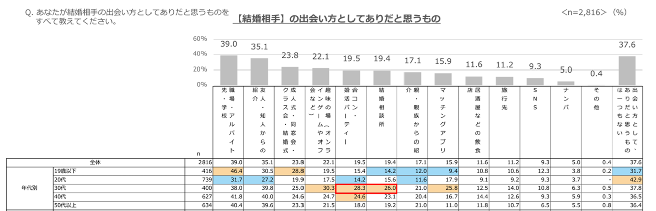 30代では「合コン・婚活パーティー」「結婚相談所」の割合が高いことから、日常生活以外の場所で「自分に合う相手」を探していることが読み取れます。
