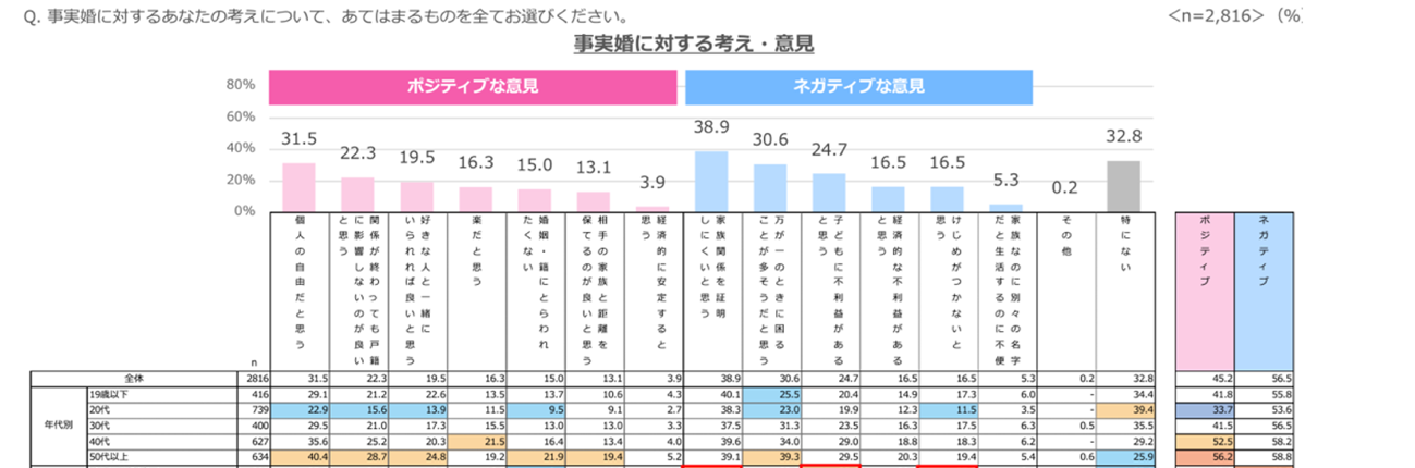 一方、事実婚に関するネガティブな意見として「家族関係を証明しにくいと思う」が全年代で38.9%と最も多くなっています。