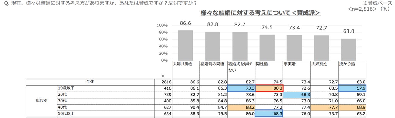 事実婚や夫婦別姓、同性婚などさまざまな結婚に対する考えに対し、全体で賛成と回答している割合は半数以上。「同性婚」は50歳以上では68.3%であったのに対し、19歳以下では80.3%が賛成と答えています。