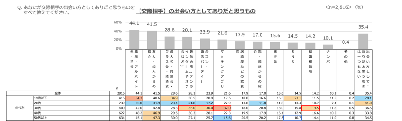 若年層では、日常生活のなかで自然に出会いたいと思う割合が強い傾向にありますが、30代では、日常生活の中で若年層の頃より自由時間が減り、新しく出会う機会が少なくなっていることで、積極的に出会うためにさまざまな場所やツールを活用しているのではないでしょうか。