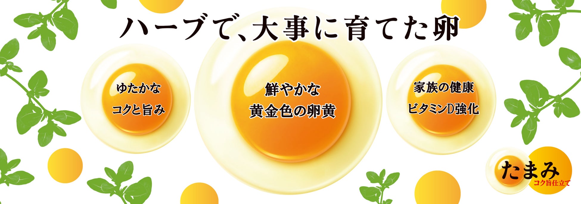 天然ハーブを鶏に与えて卵独特の臭みを抑え、旨みとコクを付加した「風味」(※新・風味アップ製法[特許登録])、調理時の食欲をそそる鮮やかな「色」、人の健康維持に寄与する「ビタミンD強化(4.0~8.0μg/100g可食部※1)」が特徴です。 ※1:普通卵1.3µg:日本食品標準成分表2020より