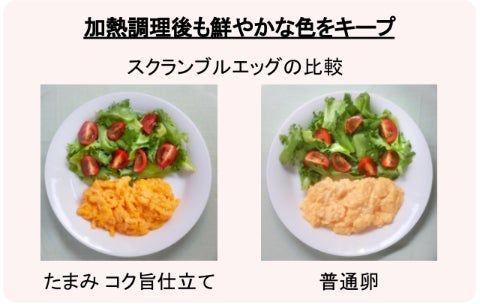 本商品は、加熱調理した時の食欲をそそる鮮やかな色調を実現するため、どのような調理法でもおいしそうに見えるよう、黄色と赤色の天然色素の絶妙なバランスを取ることに成功しました。また、鶏に天然ハーブを与えることで、旨みを高め、卵独特の臭みを抑えたおいしい卵に仕上げています。(新・風味アップ製法[特許登録]、次ページ「たまみの生産技術」を参照)