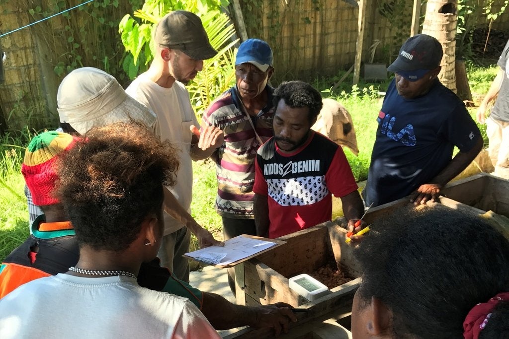 またカカオ豆の品質を左右する、原産国で行われる「発酵・乾燥」の工程を研究し、そのレクチャーを農家さんに行っています。