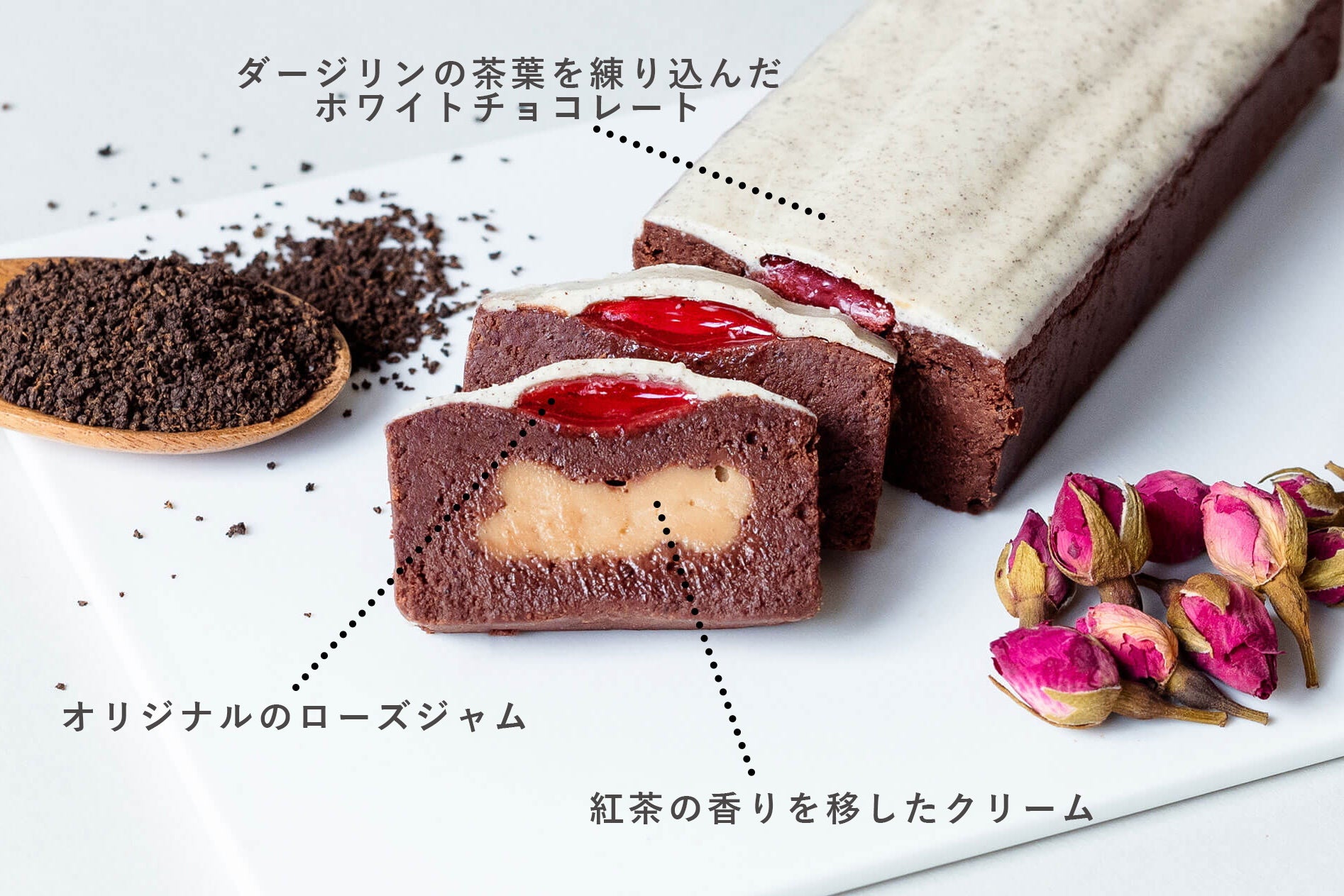 トップのダージリンの茶葉を練り込んだホワイトチョコレートに、カットするとあらわれる中央部分の紅茶のクリーム、アクセントの色鮮やかなローズジャム。紅茶・ローズ・チョコレートが心地よく移ろい、リッチな味わいをお楽しみいただけます。