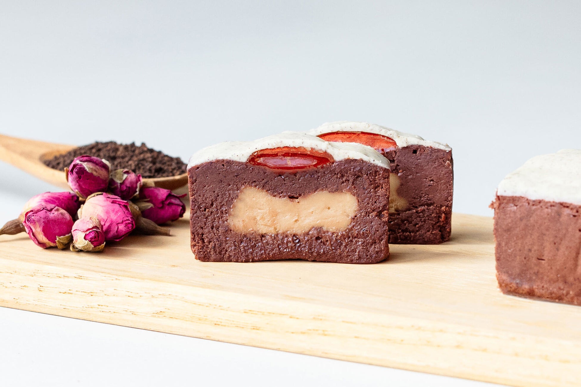 見た目も華やかで、口の中でフレーバーティーのようなリッチな香りと味わいを楽しめる気品ある大人の生ガトーショコラ。紅茶とローズ、そしてチョコレートが調和した、上品で特別な味わいをお楽しみください。