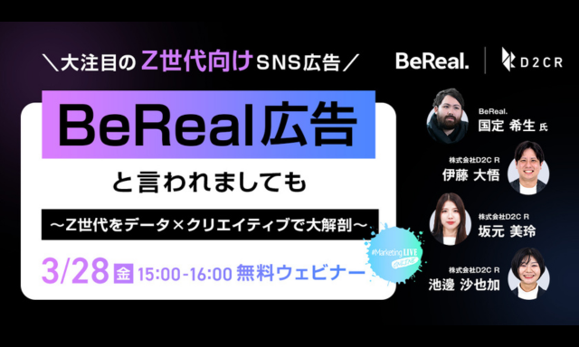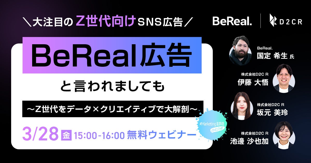 株式会社D2C R(本社:東京都港区、代表取締役社長:豊永 雅史、以下D2C R)は、BeReal.(所在地:フランス・パリ、代表者:Aymeric Roffé、以下BeReal)と共に、Z世代に急速に広がりを見せているBeRealとは一体何なのか?新しい広告表現が可能なのか?などについて、当社Z世代研究プロジェクト「ゼットモ~Z世代と言われましても〜」による調査データとクリエイティブを活用した、Z世代マーケティングについて紐解く無料ウェビナーを3/28(金)に実施いたします。