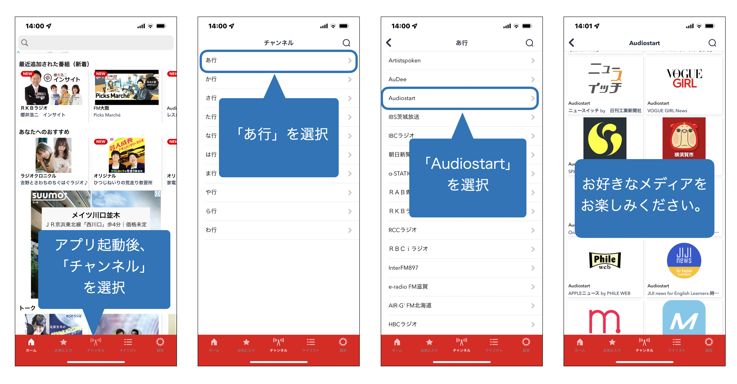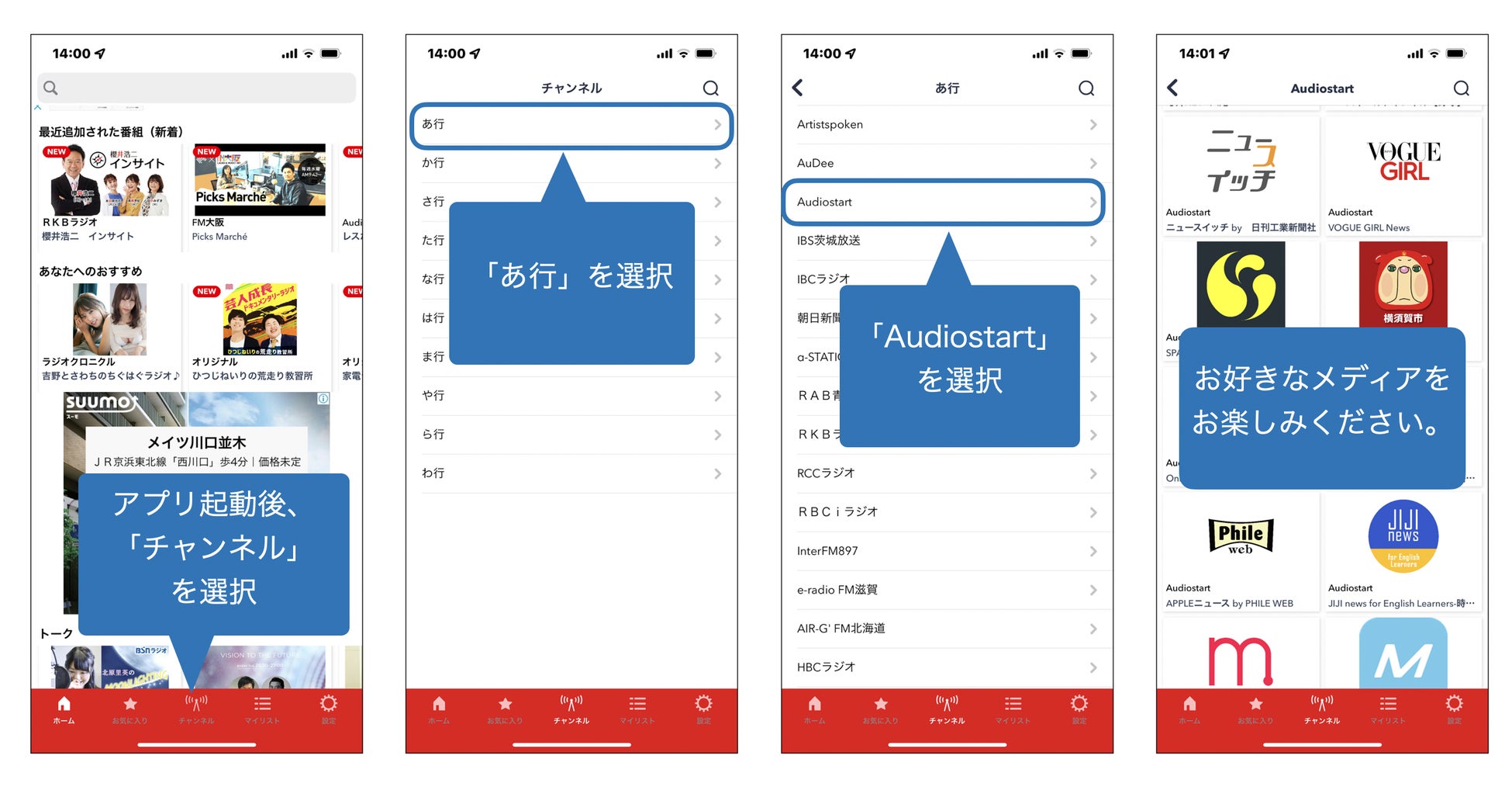 ラジオクラウドアプリをインストール、アプリ起動後「チャンネル」を選択、「あ行」を選択、「Audiostart」を選択いただければ、Audiostartで音声化した様々なジャンルの200を超える音声メディアをお楽しみいただけます。