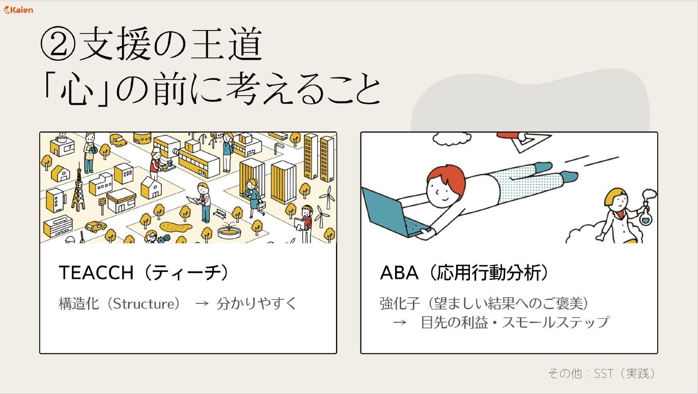 発達障害者支援では、「心のケア」を考える前に、環境を整えることが重要です。主なアプローチには以下の方法があります。