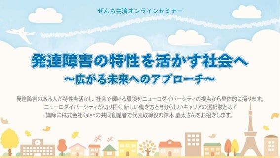 障害者向けの保険を取り扱う専門保険会社、ぜんち共済株式会社(本社:東京都千代田区、代表取締役社長:榎本重秋)は、10月26日(土)に株式会社Kaien共同創業者・代表取締役 鈴木慶太氏に登壇いただき、『発達障害の特性を活かす社会へ~広がる未来へのアプローチ~』と題しオンラインセミナーを開催しました。当日の様子をレポートします。