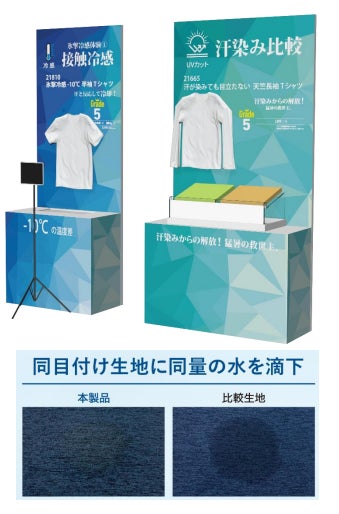 特殊生地、加工を施すことで夏につきものである「嫌な汗染み」が目立たなくなるウェアを開発。 実験コーナーでは生地に水をかけどれだけ染みが目立たないかを体験することができます。