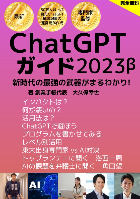 創業手帳株式会社(本社:東京都中央区京橋、代表:大久保幸世)は、本日「ChatGPTガイド2023」を新たに発行し電子版で無料で提供します。