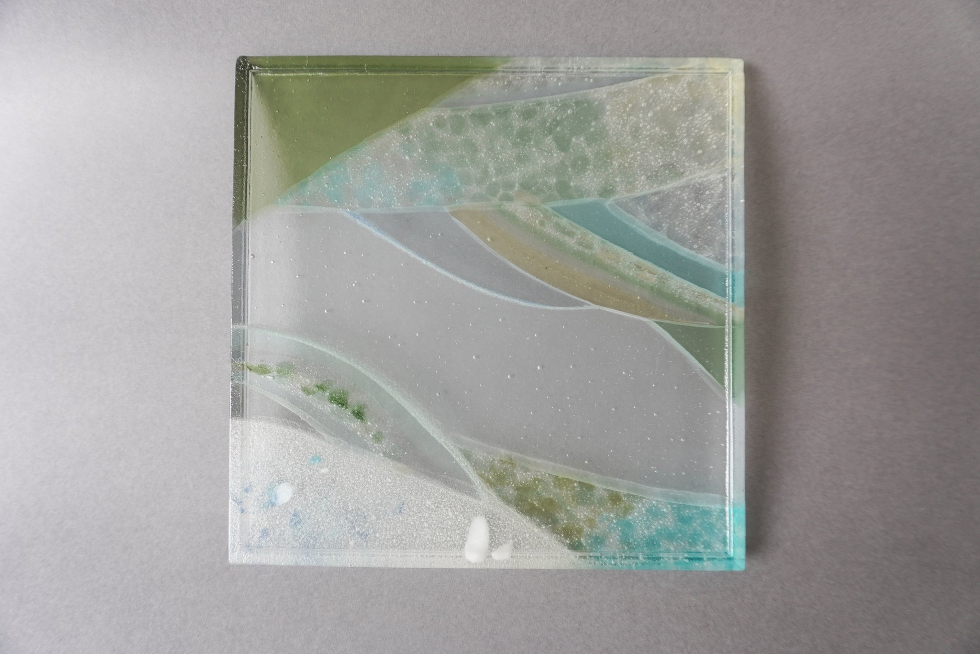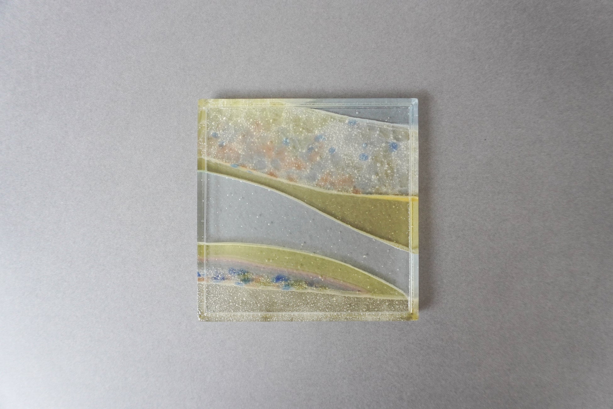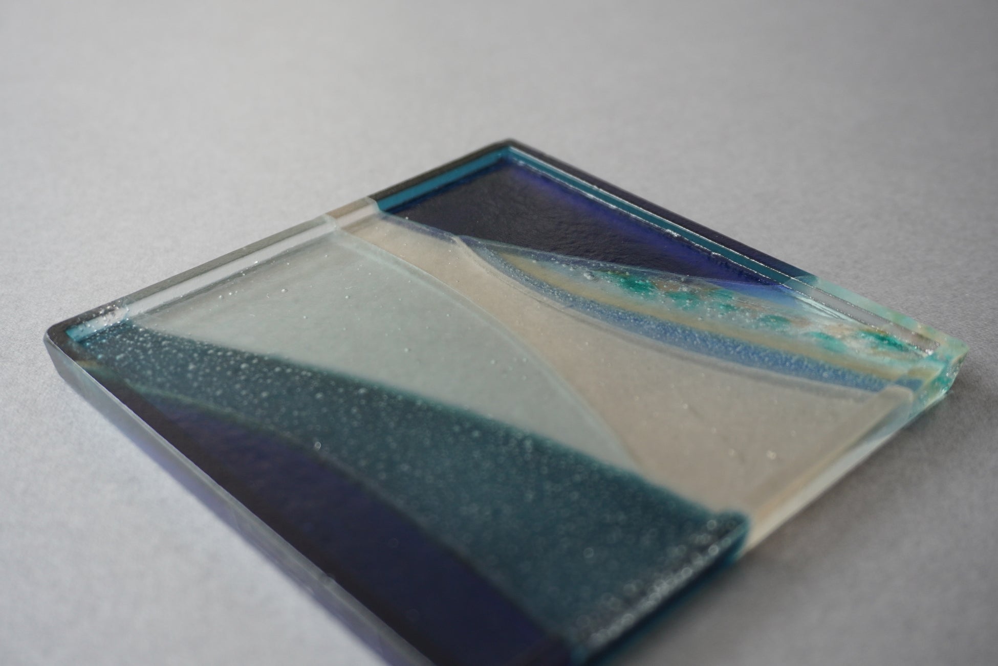 色ガラスを積層する作品制作の初まりは、沖田さんの美術大学生のころ、積層して溶け固まるガラスの塊の断面、断面から見える奥行きの美しさに惹かれたことからつながっているそうです。