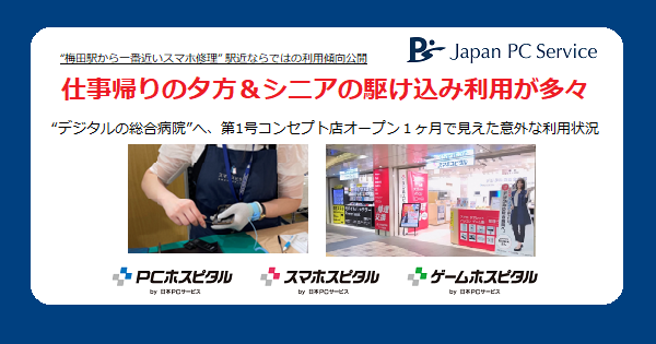 デジタル機器の修理・設定をはじめ総合サポートを行う日本PCサービス株式会社(本社:大阪府吹田市、代表取締役社長:家喜 信行、証券コード:6025、以下「当社」)は、ekimo梅田(大阪府大阪市)にオープンした『デジタルホスピタル*』第1号コンセプト店のスマホ修理の実績と相談内容から、利用者のニーズを分析しましたので報告します。2023年5月のプレオープン期間の実績から、スマホ修理の傾向や毎日使うスマホの隠れたお困りごとが見えてきました。