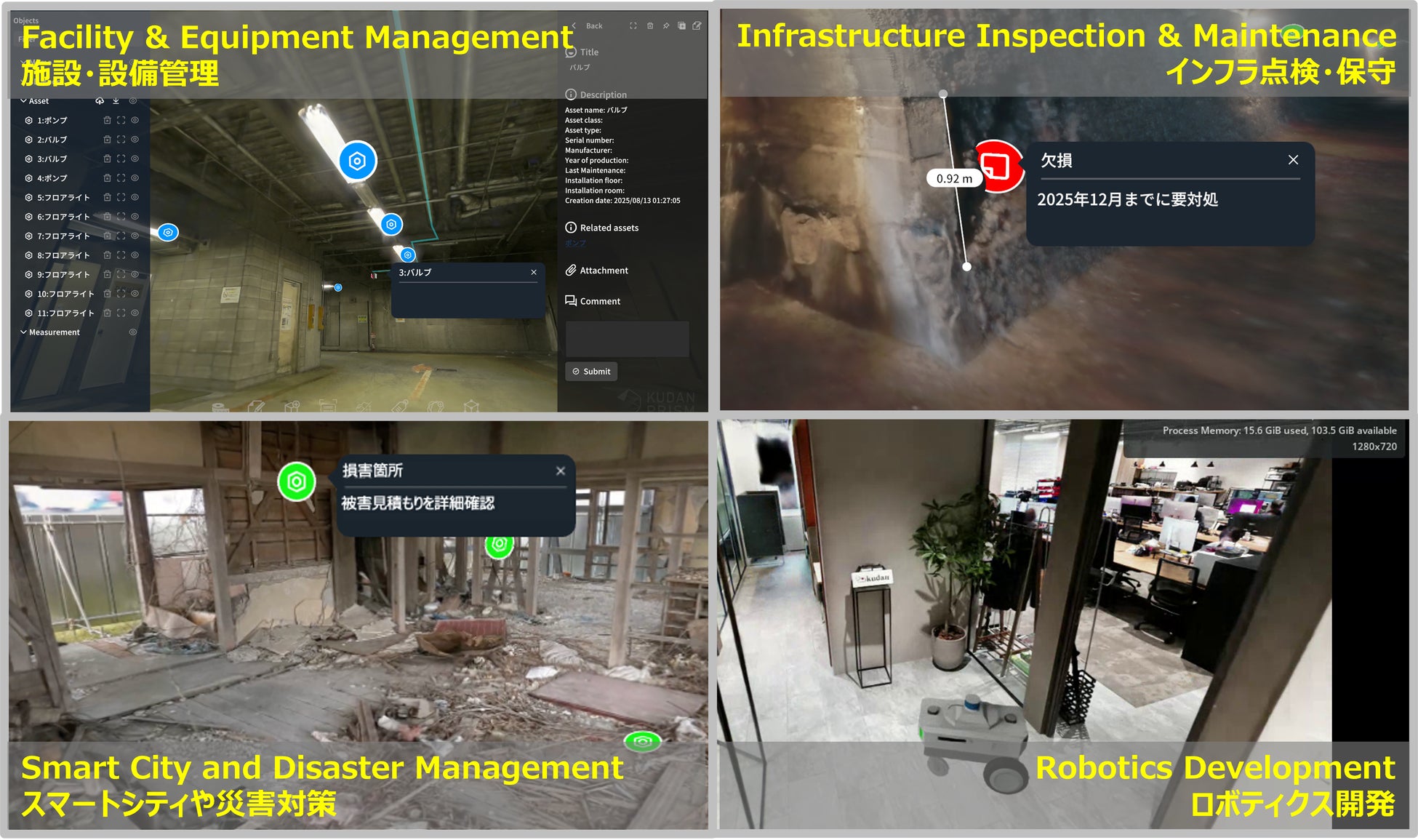 設備・施設管理、インフラ点検、ロボティクスシミュレーション、スマートシティ構想など幅広い分野で活用可能です。軽快に動くフォトリアル3D表示に、Kudanの空間知覚技術とAIによる自動処理により、管理対象の分類・タグ付け・解析まで一気通貫で実行します。これにより、直感的なデータ管理、情報連携、並びに自動化による業務効率化とサービス品質の向上を実現します。