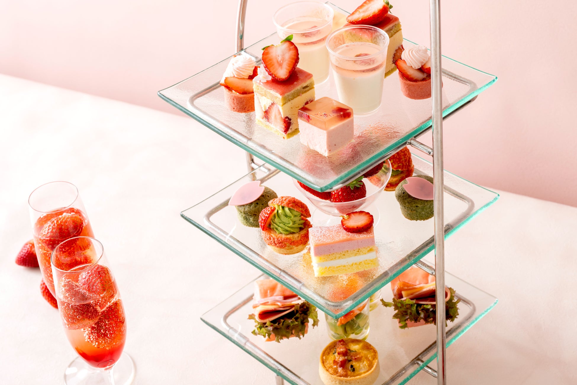 ラウンジ&バー「マリンブルー」で、人気の「ピンクストロベリーアフタヌーンティー」と大岡川夜桜クルーズが楽しめるプラン。春らしくピンク色に彩られたいちご尽くしのアフタヌーンティーセットを、種類豊富な紅茶やコーヒーとともにお楽しみいただけます。可愛らしく甘酸っぱいいちごスイーツをご堪能いただいた後は、ホテルのクルーズ船でロマンチックな夜桜見物をどうぞ。