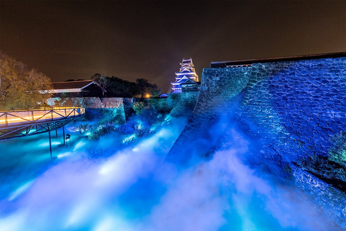 独自のスプレーノズル技術から生まれる壮大な雲海と、光や音の演出が融合し、幻想的な「雲上の熊本城」を再び皆様にお届けします。