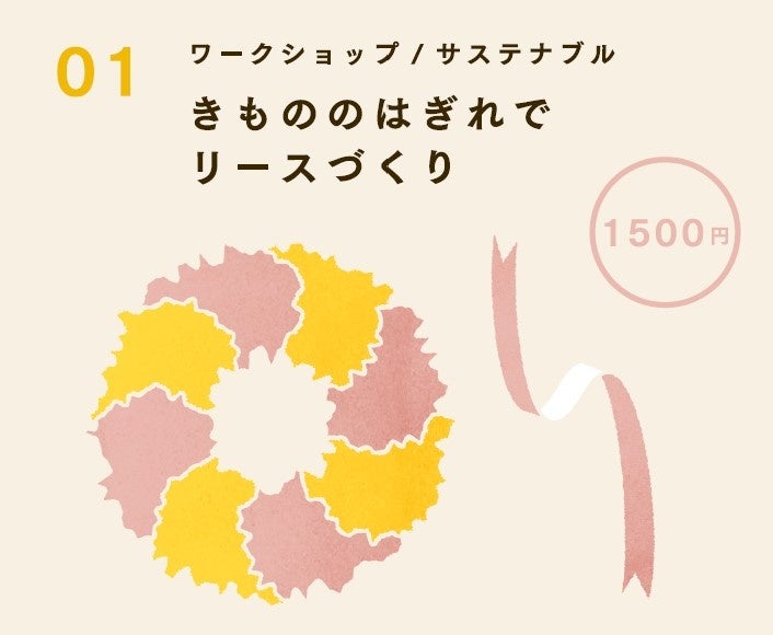 3回目の実施となる今回は、伝統工芸士に教わりながらの型染め体験や、着物のはぎれを使用したリースづくりのワークショップ(※1)などをお楽しみいただけます。他にも子どもから大人まで、楽しく日本のものづくりに触れられるブースを多数ご用意しております。入場無料なので、お気軽にご来場ください。
