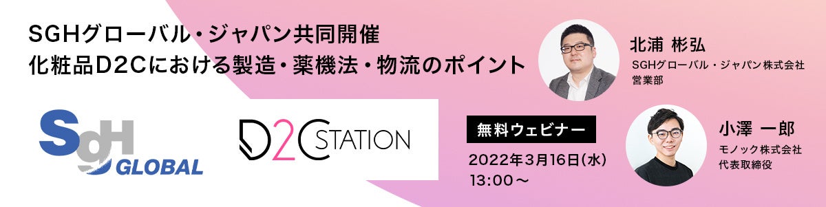 【3/16(水) 13:00】グローバルロジスティクスを提供するSGHグローバル・ジャパンとD2C STATIONを運営するモノック共催ウェビナー「化粧品D2Cにおける製造・薬機法・物流のポイント」