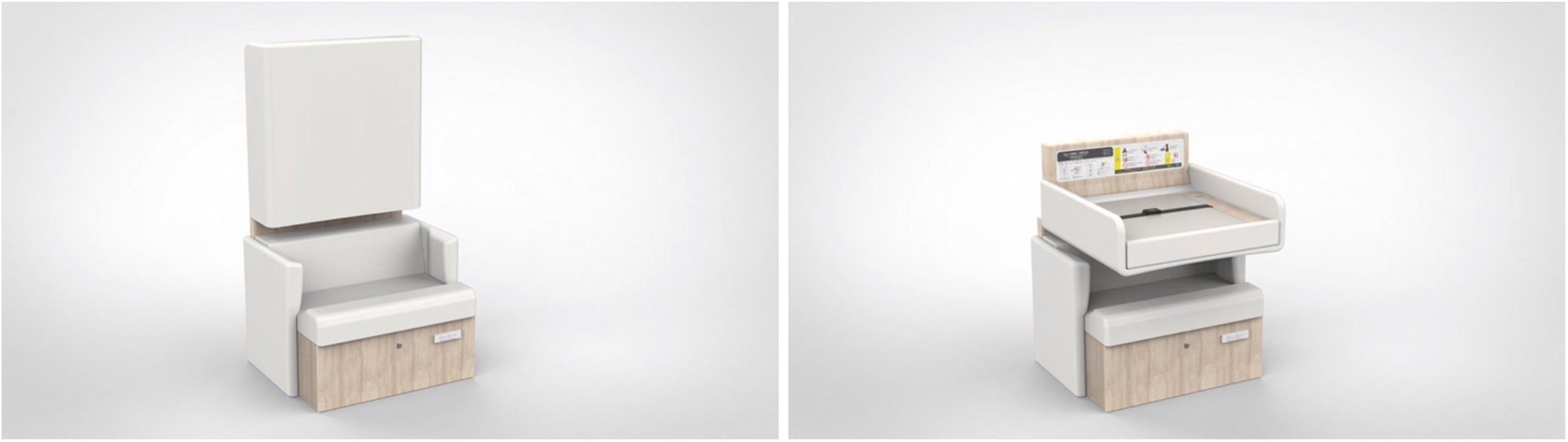 特徴 :快適で落ち着いたベビーケア環境を実現するため、ハマネツ社の鍵付きの完全個室、エアコンを装備した完成品ユニットにTrimが開発販売を行う「mamaro sofa」を搭載しています。「mamaro sofa」は背もたれ部分が変形し、ベビーベッドにもなる授乳ソファです。ベビーベッドにお子さまを寝かせると、体重測定も可能になる機能もあり、1台で授乳・おむつ替え・体重測定が可能です。製品化時には、低コスト・短時間・省スペースでの導入が可能です。