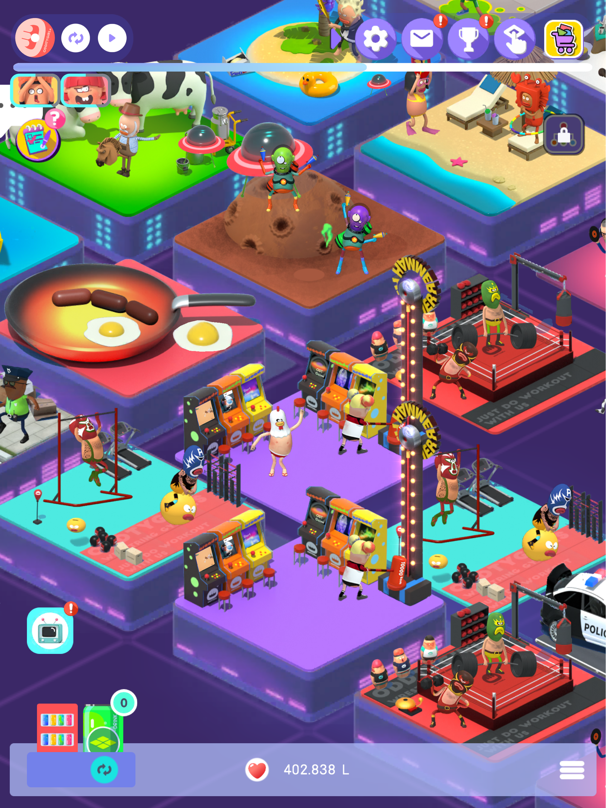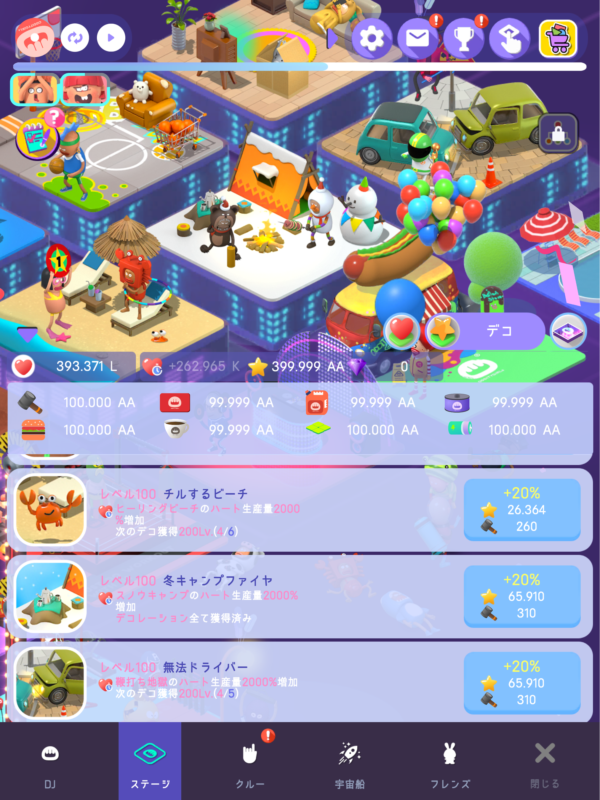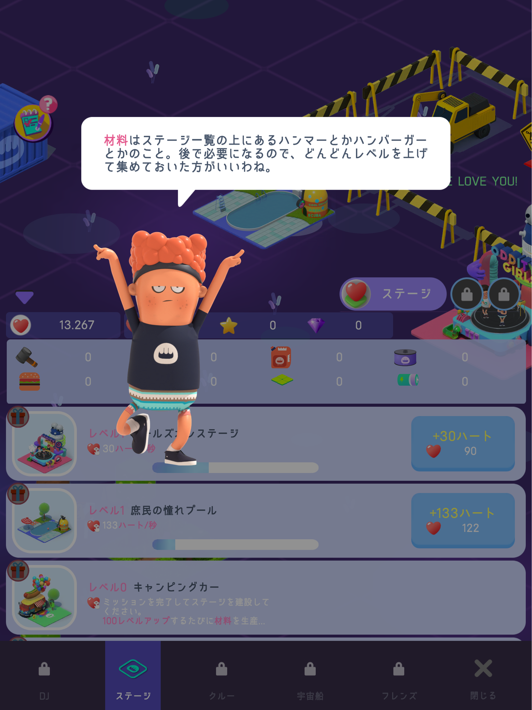 獲得したハートや材料を使ってステージをデコレーションしたり、仲間に小道具を与えることで、ハート報酬がブーストされます。