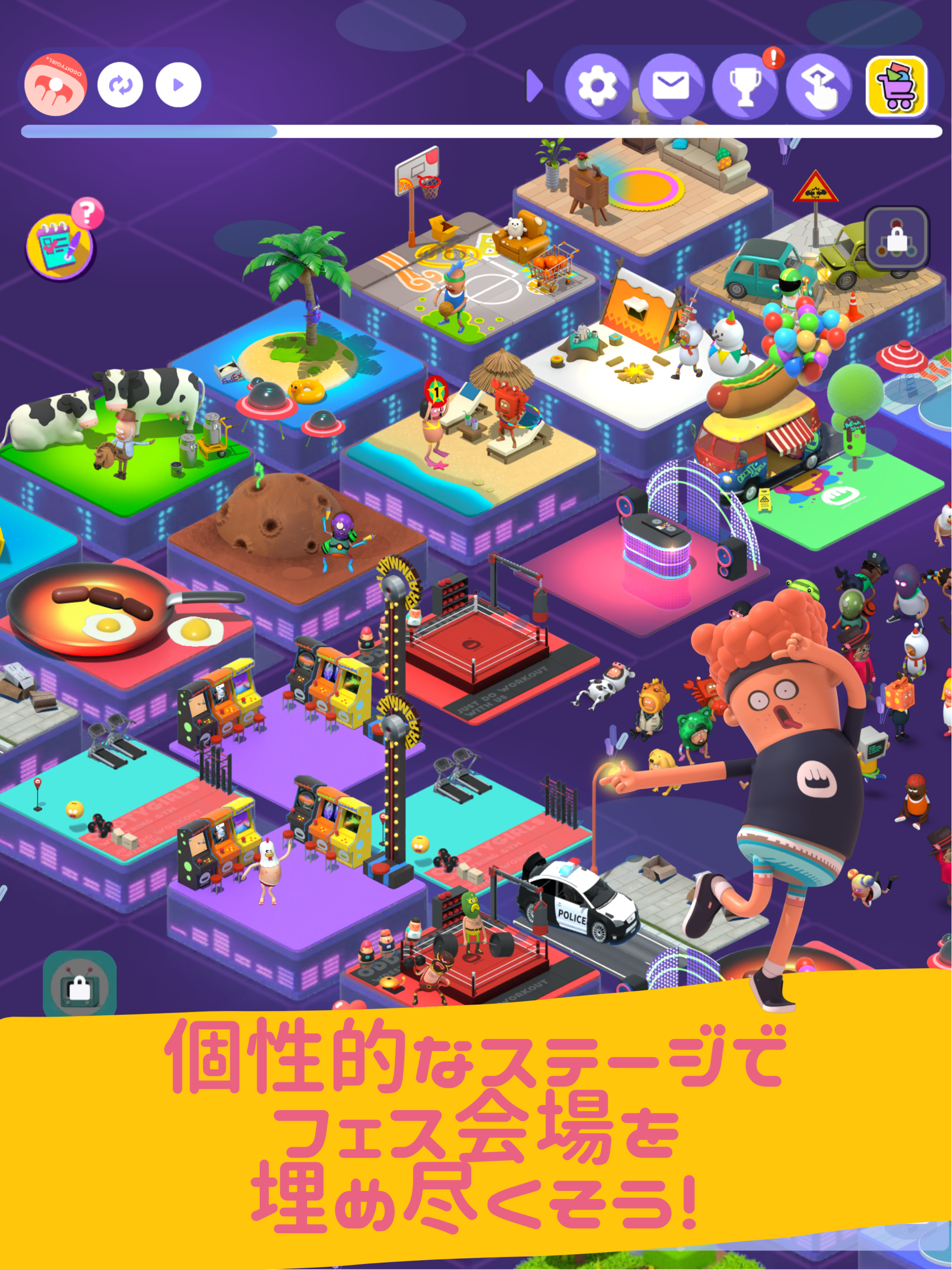 個性的なステージは合計40種類。各ステージに登場する個性的な40人の仲間達と一緒にあなただけのフェス会場を作りましょう。