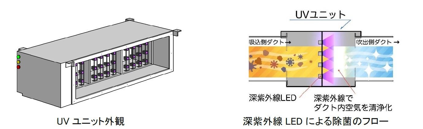 「Stela UVC」はダクト接続型のUVユニットを組み込んだ空調システムです。UVユニットには深紫外 線※2LED 「SumiRay」※3を搭載しており、循環する空気に深紫外線を効率的に照射して空気中の菌・ウイルスを除去し、室内空気を清浄化します。