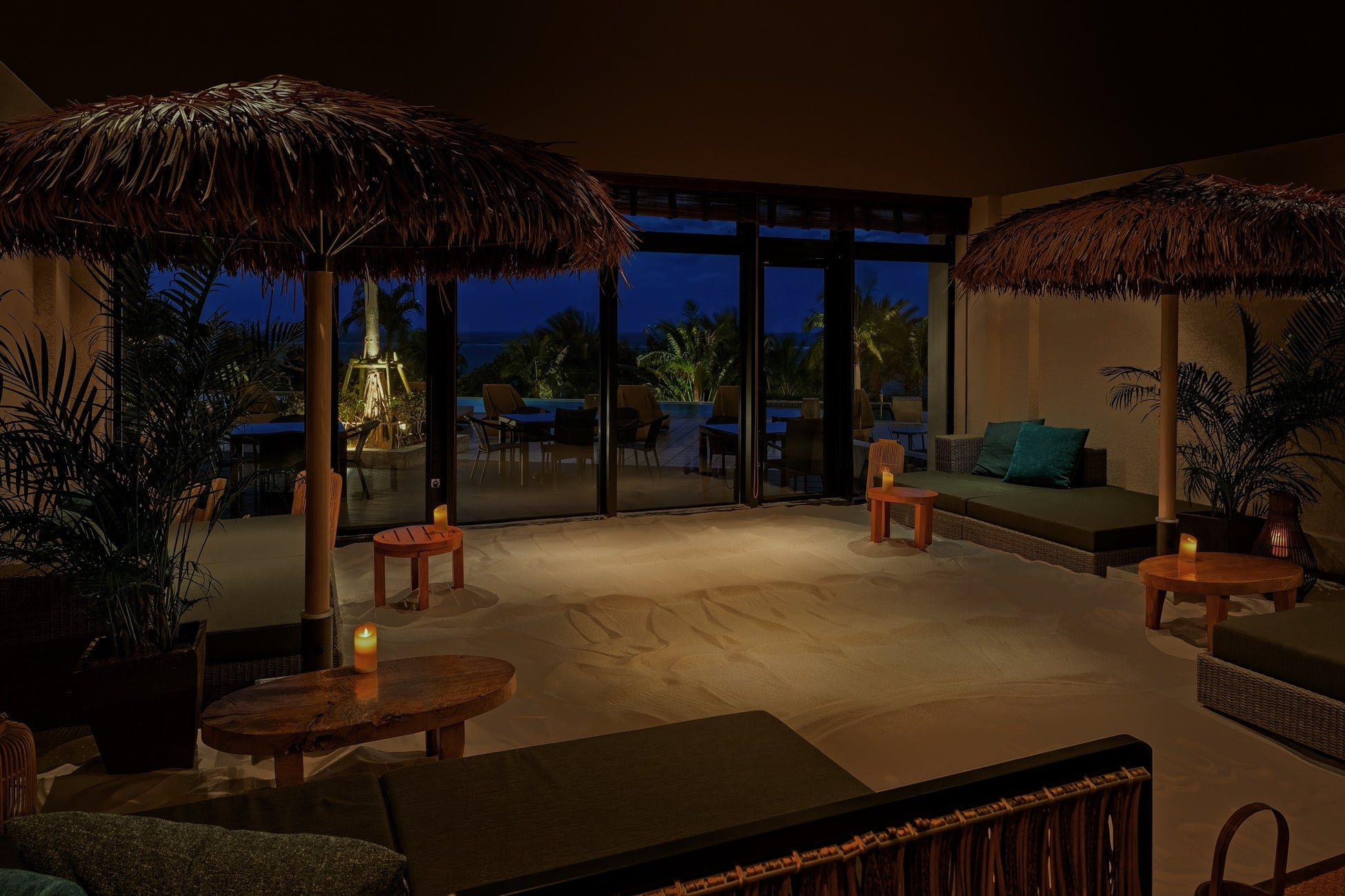 ホテル棟2Fのナイトバーでゆったりと寛ぐひとときを。サラサラのパウダーサンドのフロアを裸足で歩けば、身も心も解きほぐされていくような心地よさをご体感いただけます。ご滞在中何度でもご利用が可能。(Deli & Café Bar 営業時間18:00~23:00)