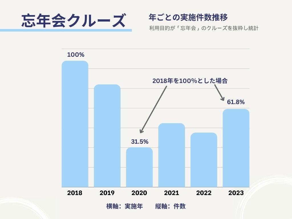 2018年はコロナ禍前であり、忘年会クルーズの実施件数が最も多く、2020年にはコロナ禍の影響により大幅に減少いたしました。しかし、2023年には、ワクチン接種率の向上や行動制限の緩和に伴い、再び忘年会クルーズの需要が高まり、実施件数が回復傾向にあることがわかりました。
