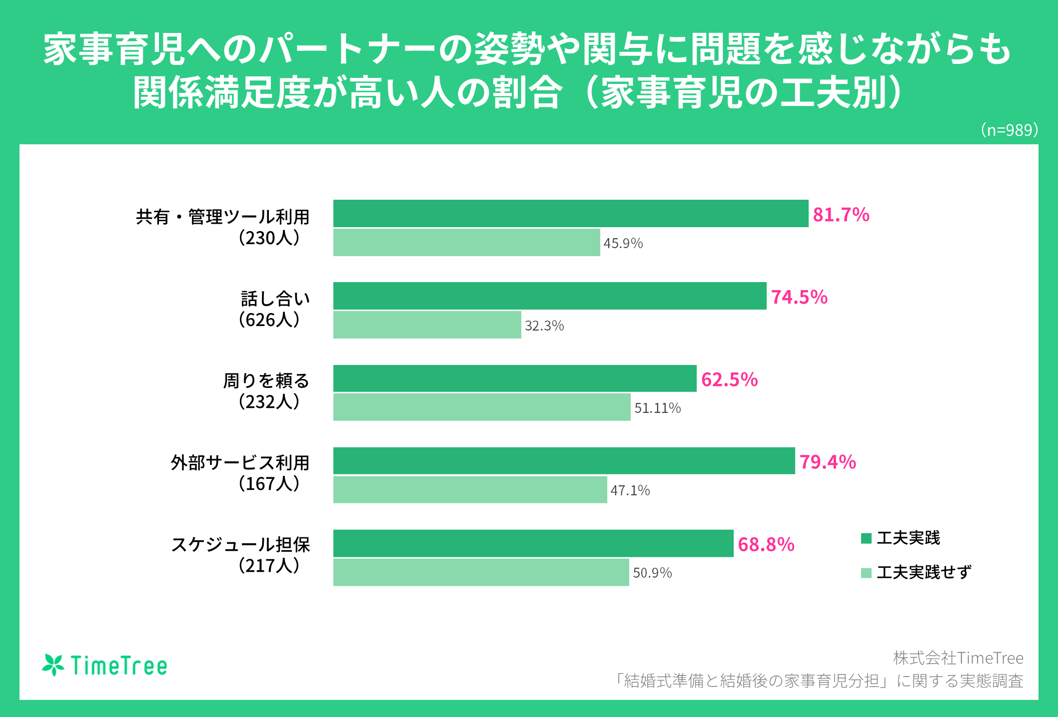 周囲の人を頼ったり、外部の業者への委託をしたりといったパートナー以外を頼る工夫ではなく、パートナーと情報を共有したり、対話を重ねてお互いの状況に理解を深めたりなど、2人で連携する姿勢が絆の深まりに繋がっていると考えられます。