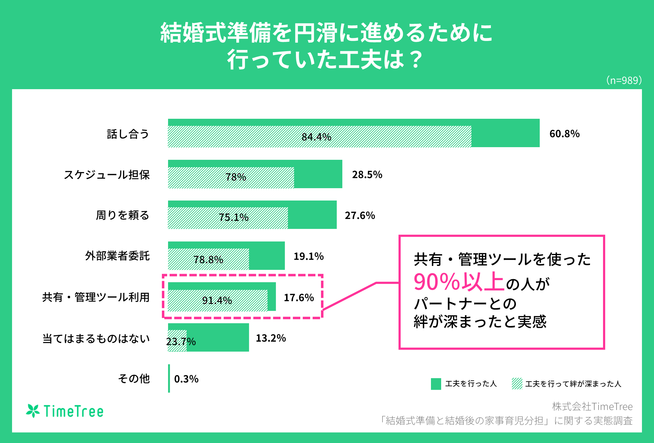 また、各工夫を実践した人の中で、結婚式で「パートナーとの絆が深まった」人の割合を見ると、最も割合が多かった「共有・管理ツール利用」は91.4%、次いで「話し合い」が84.4%という結果となりました。